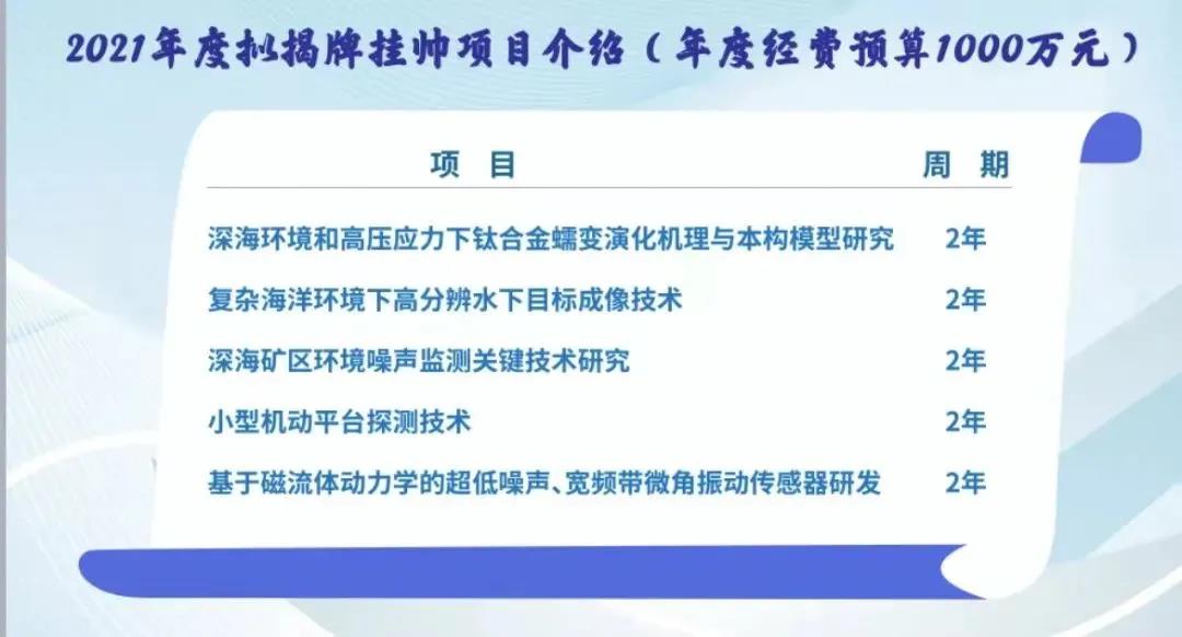 本次5個揭榜掛帥項目分別為:深海環(huán)境和高壓應(yīng)力下鈦合金蠕變演化機理與本構(gòu)模型研究、復(fù)雜海洋環(huán)境下高分辨水下目標成像技術(shù)、深海礦區(qū)環(huán)境噪聲監(jiān)測關(guān)鍵技術(shù)研究、小型機動平臺探測技術(shù)、基于磁流體動力學(xué)的超低噪聲、寬頻帶微角振動傳感器研發(fā)。