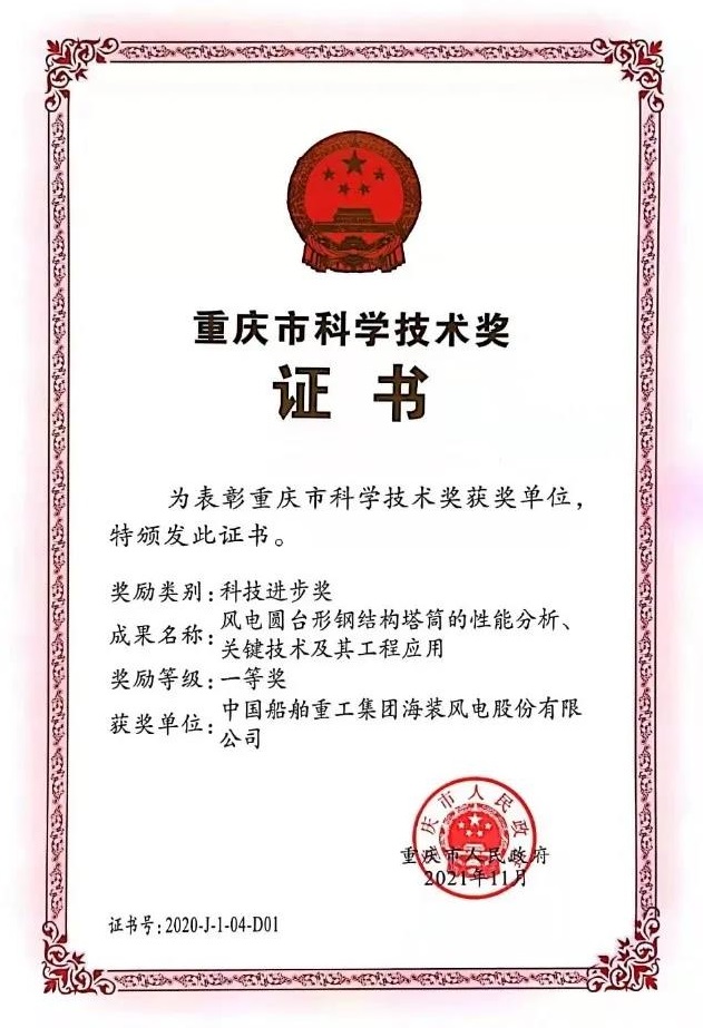 中國船舶集團(tuán)旗下中國海裝申報(bào)的兩項(xiàng)成果《高效安全大型風(fēng)電機(jī)組傳動(dòng)鏈關(guān)鍵技術(shù)與應(yīng)用》《風(fēng)電圓臺(tái)形鋼結(jié)構(gòu)塔筒的性能分析、關(guān)鍵技術(shù)及其工程應(yīng)用》榮獲重慶市科技進(jìn)步獎(jiǎng)一等獎(jiǎng)。