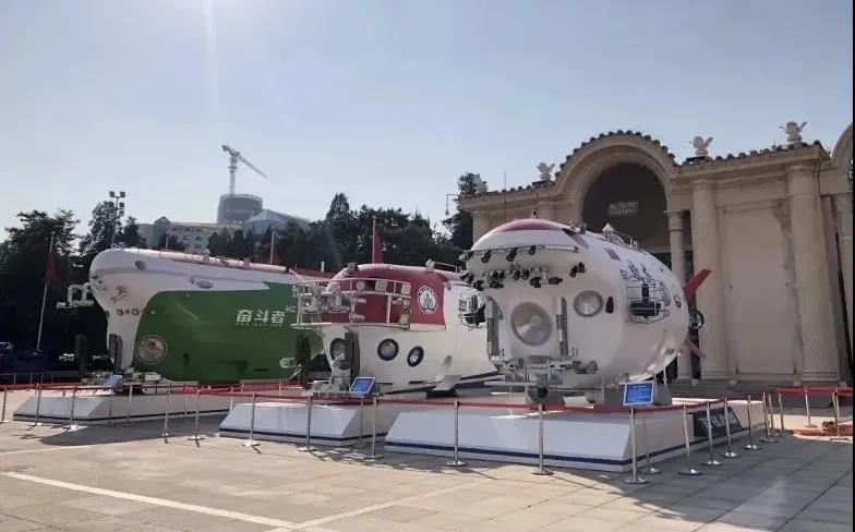 屹立展館外場的“蛟龍”號、“深海勇士”號、“奮斗者”號三臺實(shí)尺度潛水器模型。