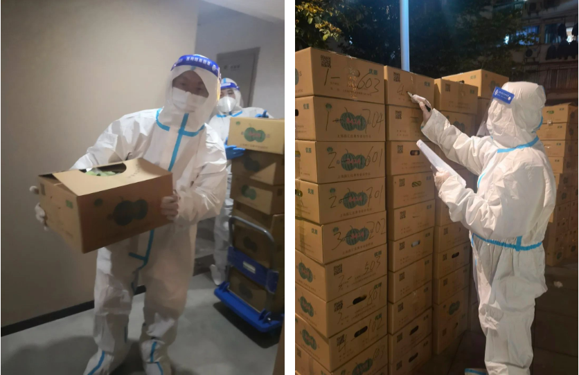 由于防護(hù)服有限,居住在黃浦區(qū)某社區(qū)的集團(tuán)職工中只有鄭珂成了志愿者,只見(jiàn)他時(shí)而忙著卸貨分裝,時(shí)而忙著打包標(biāo)記,7棟樓近400戶居民共計(jì)幾百公斤的物資,都由他一人完成了分裝和標(biāo)記工作。在他服務(wù)的對(duì)象中,既有身在涉疫樓棟無(wú)法出戶的同事,也有素未謀面的鄰居。