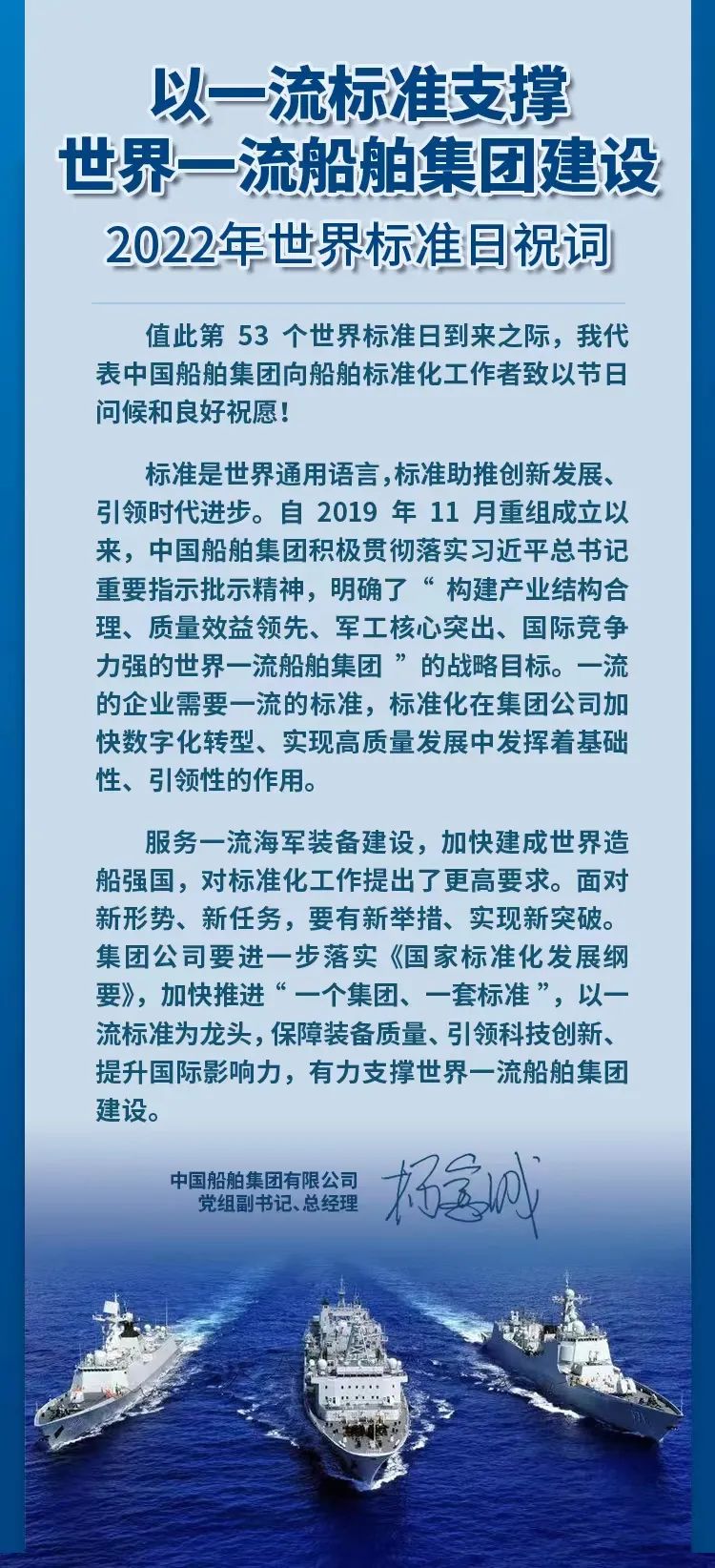 中國(guó)船舶集團(tuán)有限公司黨組副書(shū)記、總經(jīng)理?xiàng)罱鸪芍伦T~,強(qiáng)調(diào)集團(tuán)公司要進(jìn)一步落實(shí)《國(guó)家標(biāo)準(zhǔn)化發(fā)展綱要》,加快推進(jìn)“一個(gè)集團(tuán)、一套標(biāo)準(zhǔn)”,以一流標(biāo)準(zhǔn)為龍頭,保障裝備質(zhì)量、引領(lǐng)科技創(chuàng)新、提升國(guó)際影響力,有力支撐世界一流船舶集團(tuán)建設(shè),以優(yōu)異的成績(jī)迎接黨的二十大勝利召開(kāi)。