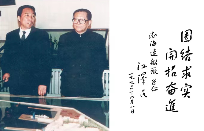 1990 年4月8日,江澤民同志視察渤海造船廠并題詞“團(tuán)結(jié)求實(shí),開拓奮進(jìn)”。