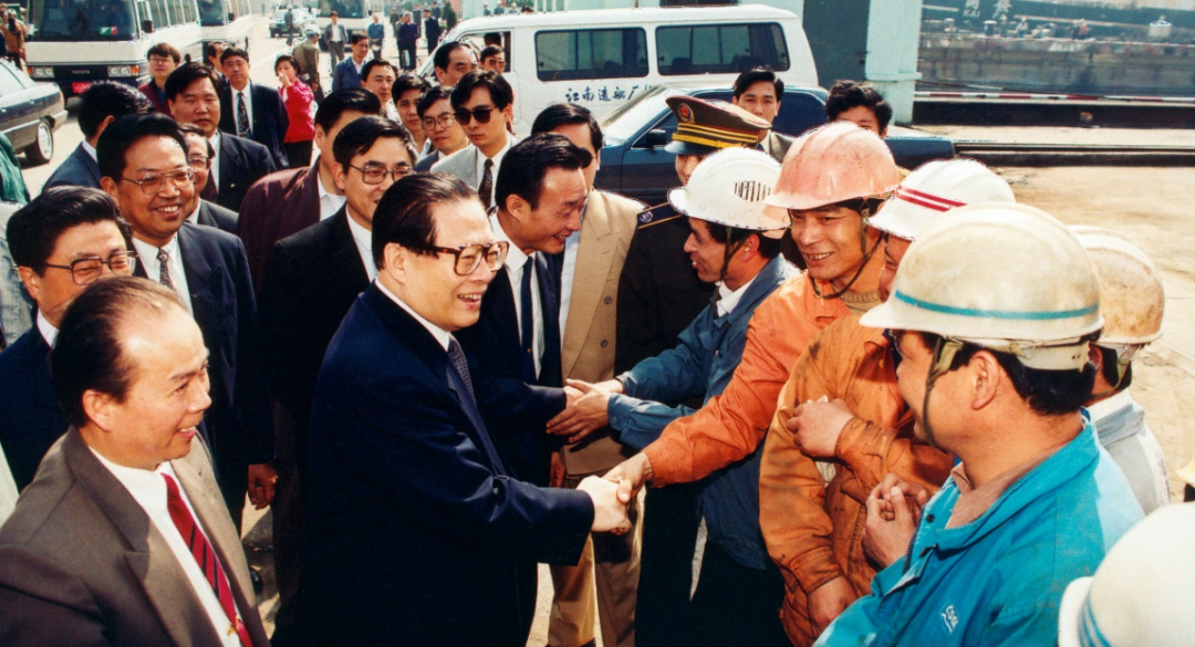 1994年4月29日,江澤民同志在視察江南造船時看望工人。