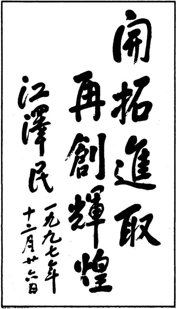 1997年12月26日,江澤民同志為中國船舶工業(yè)總公司題詞:“開拓進(jìn)取,再創(chuàng)輝煌”。
