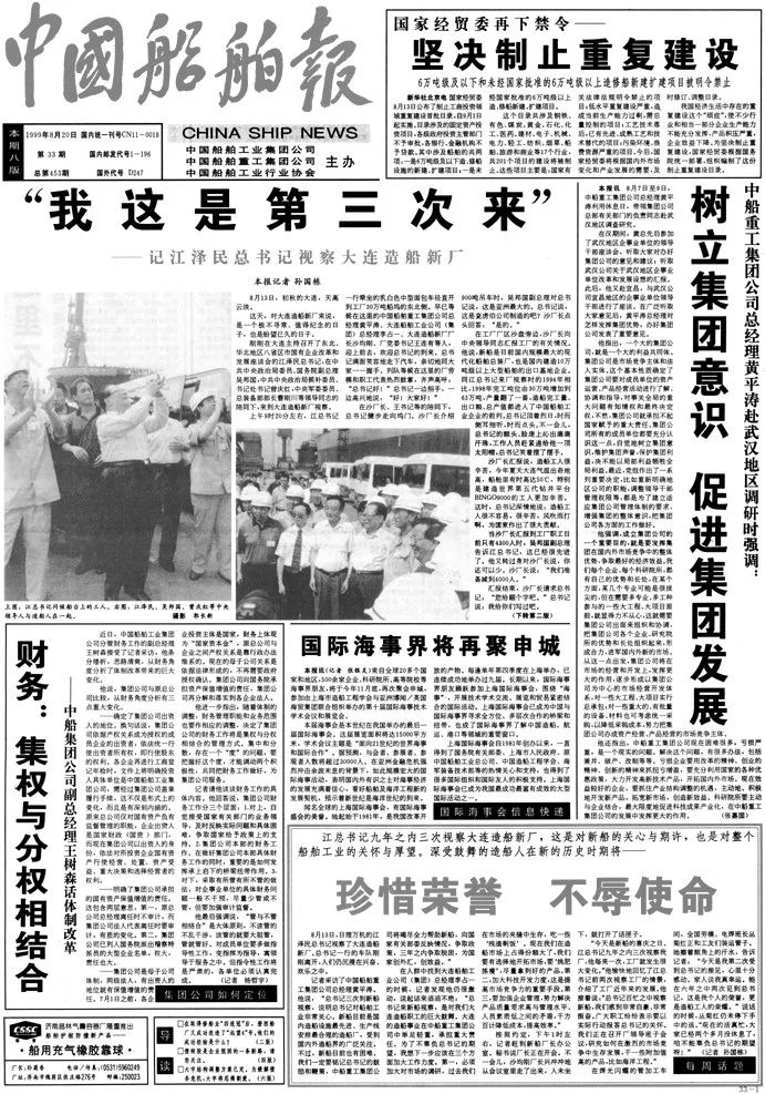 1999年8月20日,《中國船舶報》報道江澤民同志第三次視察大船集團(tuán)。