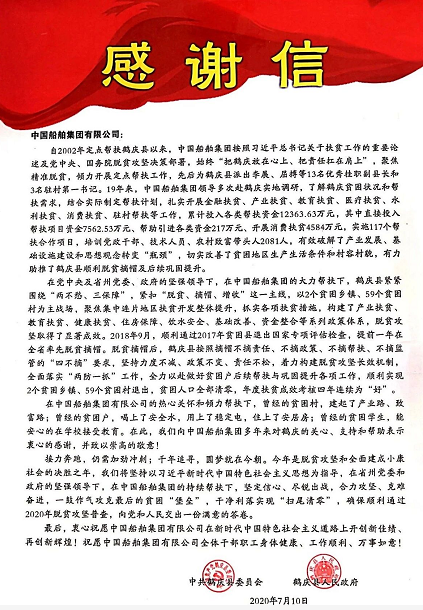 近日,中國(guó)船舶集團(tuán)收到了一封來自云南鶴慶的感謝信。從初識(shí)到現(xiàn)在,我們已在脫貧攻堅(jiān)的戰(zhàn)場(chǎng)上,攜手奮戰(zhàn)19載,如今正一鼓作氣攻克最后的貧困“堡壘”。