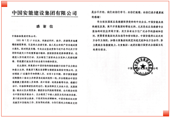 近日,擔(dān)負(fù)國家應(yīng)急救援職責(zé)使命的中國安能建設(shè)集團(tuán)有限公司發(fā)來一封感謝信。