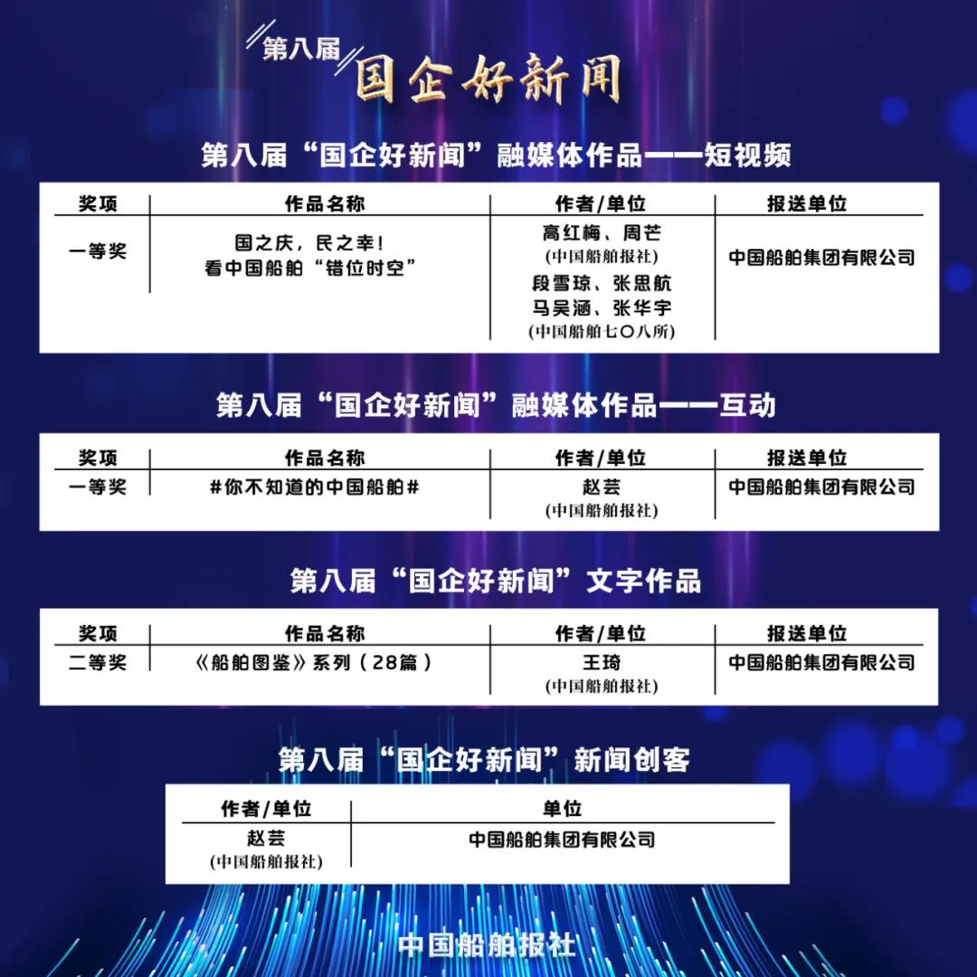 1月11日,第八屆“國企好新聞”獲獎作品正式揭曉,中國船舶集團(tuán)斬獲4項大獎,涵蓋系列報道、短視頻、融媒體作品等多種體裁。其中,一等獎2項、二等獎1項,并首次榮膺十大新聞創(chuàng)客獎,獲獎名單如下: