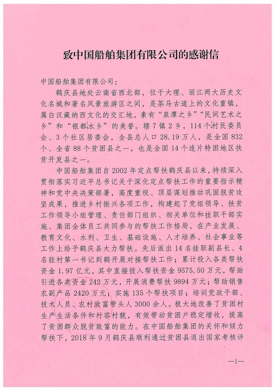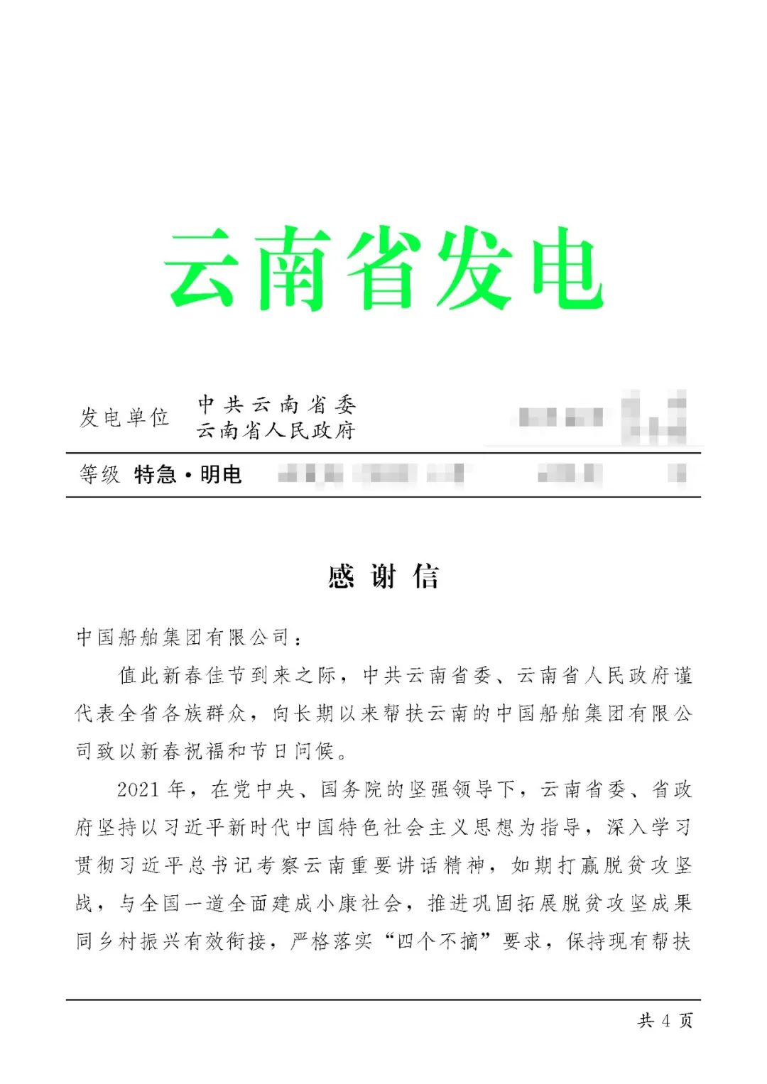 春節(jié)前夕,中國船舶集團陸續(xù)收到云南省委省政府、文山州委州政府、鶴慶縣委縣政府、勐臘縣政府發(fā)來的感謝信,對集團公司長期以來給予鶴慶縣、勐臘縣、丘北縣的傾力幫扶表示衷心感謝和崇高敬意。