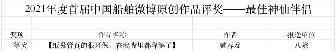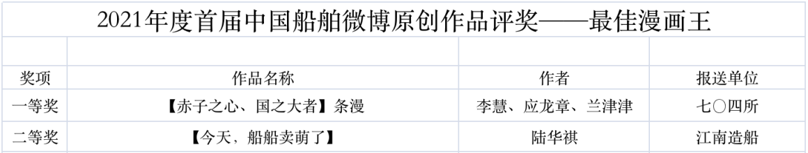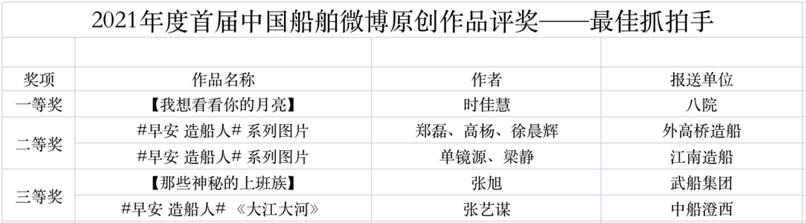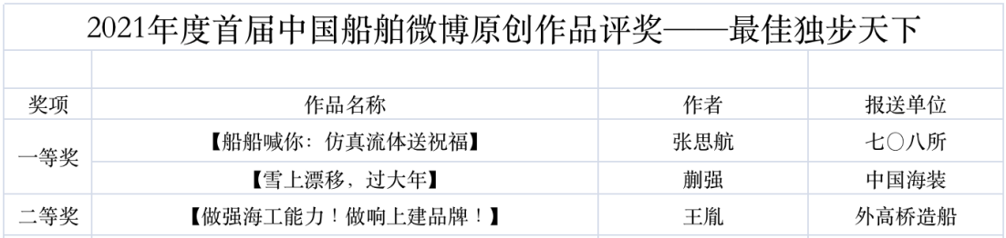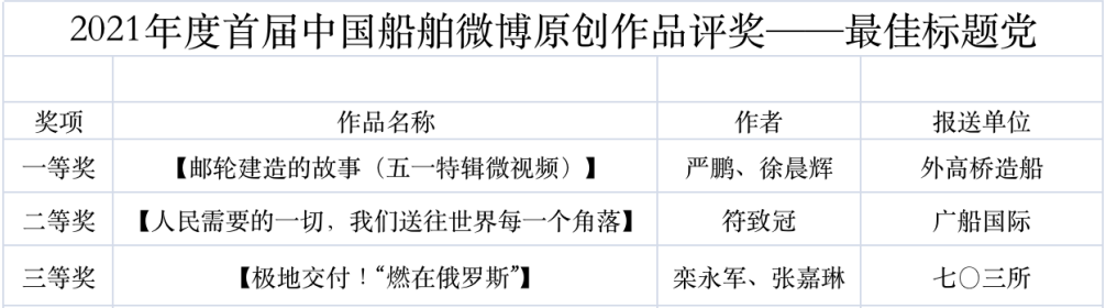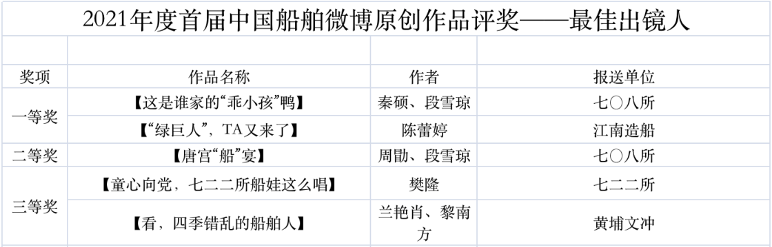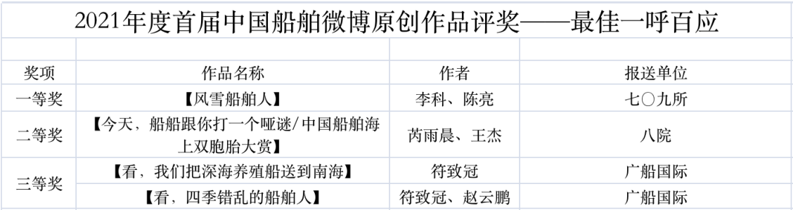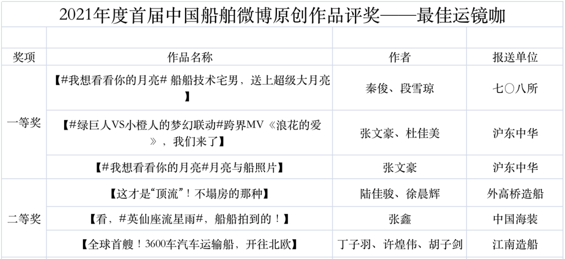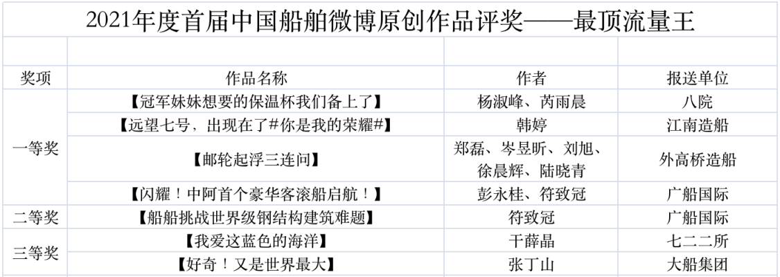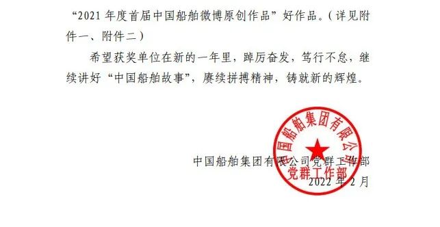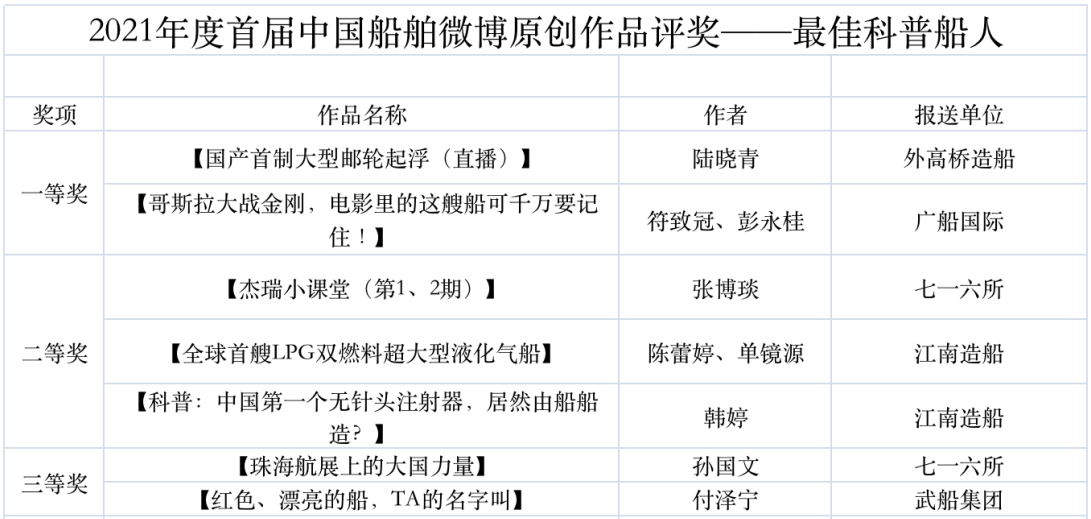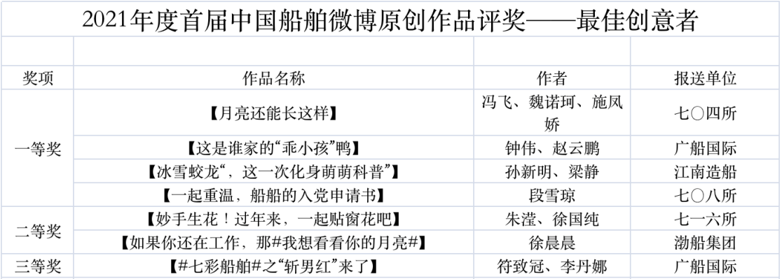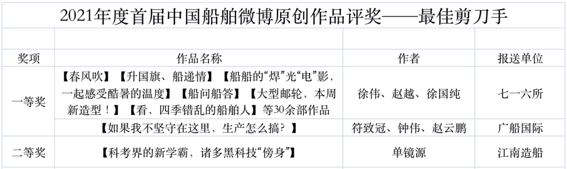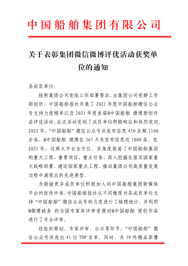 為鼓勵更多成員單位積極加入到中國船舶集團(tuán)新媒體平臺的宣傳中來,在集團(tuán)公司黨群工作部的指導(dǎo)下,中國船舶報(bào)社從不同維度,對2021年度各單位支持“中國船舶”微信的力度進(jìn)行了梳理統(tǒng)計(jì),并利用微博政務(wù)的全國專家?guī)煸u審資源,對2021年度“中國船舶”微博原創(chuàng)作品進(jìn)行了專業(yè)評審,評選結(jié)果公布如下: