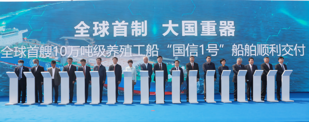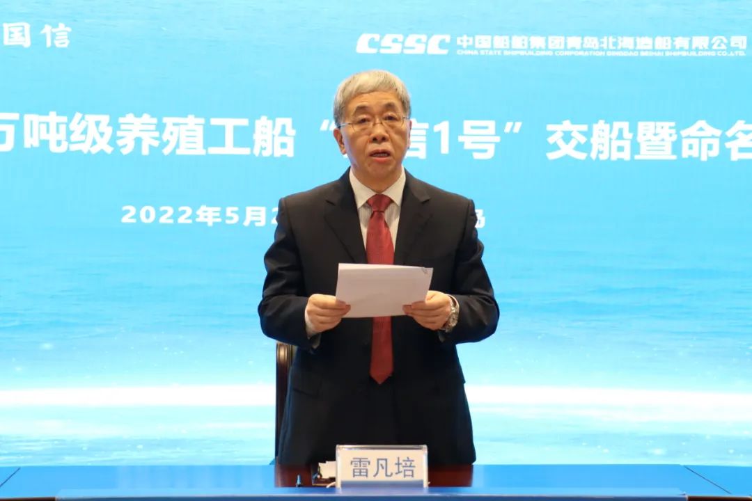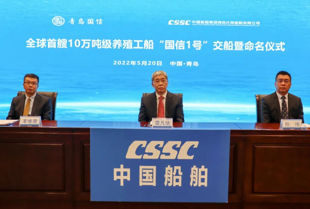 5月20日,中國船舶集團旗下青島北海造船有限公司為青島國信發(fā)展(集團)有限責任公司建造的全球首艘10萬噸級智慧漁業(yè)大型養(yǎng)殖工船“國信1號”交船命名儀式在青島舉行。中國船舶集團黨組書記、董事長雷凡培,黨組成員、副總經理孫偉通過視頻出席儀式,山東省人民政府黨組成員、副省長凌文,青島市委副書記、市長趙豪志,中國海洋大學黨委副書記、校長于志剛,中國工程院院士麥康森等領導和嘉賓出席儀式。青島市副市長趙燕為新船命名。