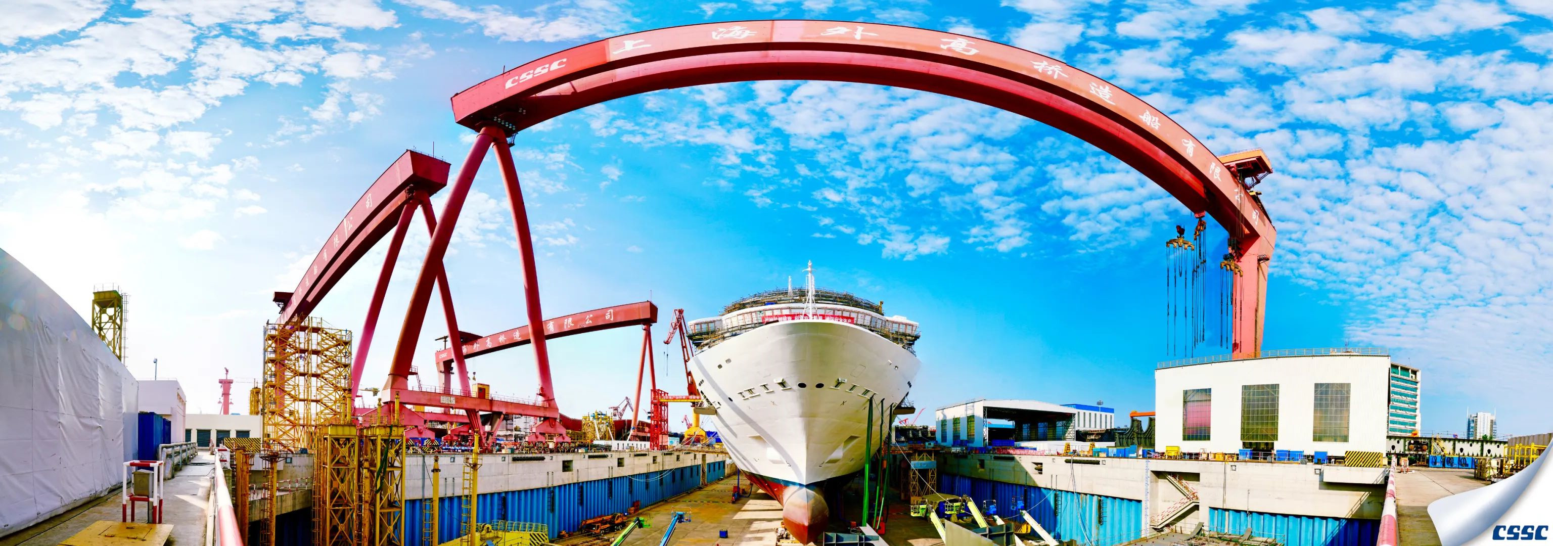 艷陽(yáng)下的外高橋造船基地,半遮面紗的中國(guó)首制大型郵輪矗立其中,天地之間都似是她的舞臺(tái),讓我們翹首以待她真正的芳容吧。