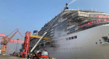 船舶建造過程中動(dòng)火作業(yè)多、交叉作業(yè)多、有限空間多,消防安全一直以來都是企業(yè)安全生產(chǎn)工作的重點(diǎn)。本次演練選取大型郵輪作為演練對象,情景模擬船上發(fā)現(xiàn)火情后,外高橋造船以及聯(lián)合演練單位的消防隊(duì)伍實(shí)施協(xié)同救援,包括初期火情應(yīng)對、應(yīng)急報(bào)告、船上人員疏散、被困人員搜救、滅火等內(nèi)容,檢驗(yàn)了企業(yè)應(yīng)對突發(fā)火情的快速反應(yīng)能力和協(xié)同作戰(zhàn)能力。
