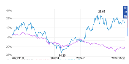 很顯然,中船系憑其創(chuàng)新和產(chǎn)業(yè)鏈優(yōu)勢(shì)已成為中國(guó)資本市場(chǎng)一股新生力量。中國(guó)船舶集團(tuán)龍頭股中國(guó)船舶(600150)2022年11月30日收盤價(jià)比去年同期上漲約20%,跑贏大市。下圖為2022年11月30日中國(guó)船舶與滬深300指數(shù)漲跌對(duì)比圖,上部曲線為中國(guó)船舶,下部曲線為滬深300。