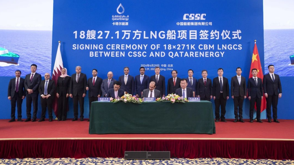4月29日,中國(guó)船舶集團(tuán)有限公司與卡塔爾能源在京舉行18艘全球最大27.1萬立方米超大型液化天然氣(LNG)運(yùn)輸船項(xiàng)目簽約儀式。工業(yè)和信息化部副部長(zhǎng)單忠德,外交部西亞北非司大使呂健,中國(guó)船舶集團(tuán)董事長(zhǎng)溫剛、副總經(jīng)理盛紀(jì)綱,卡塔爾能源事務(wù)國(guó)務(wù)大臣、卡塔爾能源總裁兼首席執(zhí)行官薩阿德·謝里達(dá)·阿爾卡比,卡塔爾能源天然氣首席執(zhí)行官卡利德·阿爾-塞尼,卡塔爾能源商務(wù)和業(yè)務(wù)發(fā)展執(zhí)行副總裁賈西姆·阿爾馬拉祖齊等領(lǐng)導(dǎo)和嘉賓出席簽約儀式。