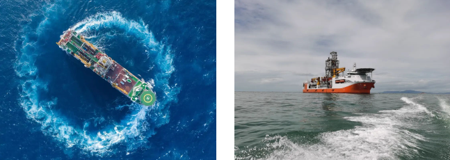 # 通過配置最先進(jìn)的DP-3級動力定位系統(tǒng),自動調(diào)整船舶底部7臺推進(jìn)器的轉(zhuǎn)向和推力大小,來抵抗海上風(fēng)、浪、流作用在船上的載荷,使船舶在海上保持一定的水平位置;