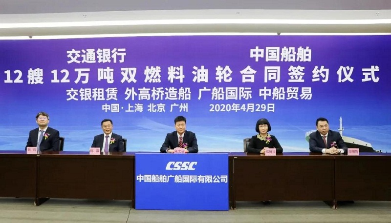 ????4月29日,中國船舶集團(tuán)有限公司旗下中國船舶工業(yè)貿(mào)易有限公司、上海外高橋造船有限公司、廣船國際有限公司與交通銀行股份有限公司旗下交銀金融租賃有限責(zé)任公司在北京、上海、廣州三地以“云簽約”方式簽署12艘12萬噸雙燃料油船建造合同,合同總金額約46億元人民幣,這是中國船舶集團(tuán)旗下單位近期承接的又一單筆大額訂單。中國船舶集團(tuán)黨組書記、董事長雷凡培,交通銀行黨委書記、董事長任德奇,中國船舶集團(tuán)黨組成員、副總經(jīng)理孫偉,交通銀行黨委委員、副行長呂家進(jìn)出席簽約儀式。