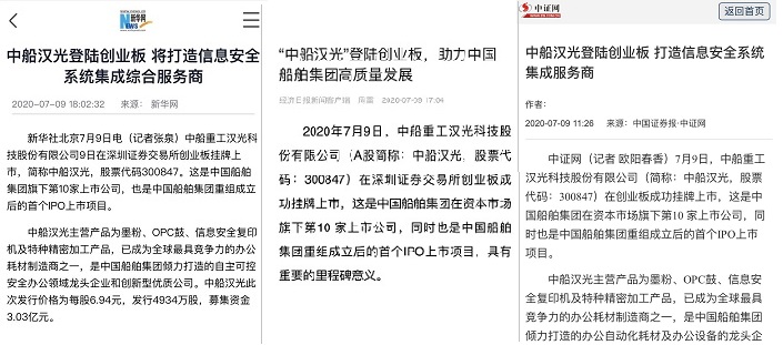 中船漢光成功上市在業(yè)內(nèi)引起強(qiáng)烈反響,新華社、經(jīng)濟(jì)日報以及中國證券報等主流媒體紛紛進(jìn)行了報道。