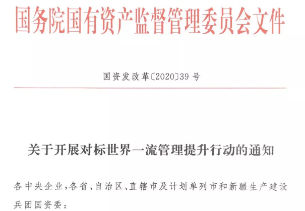 6月13日,國資委正式印發(fā)《關(guān)于開展對標(biāo)世界一流管理提升行動的通知》(以下簡稱《通知》),對國有重點(diǎn)企業(yè)開展對標(biāo)提升行動作出部署安排。