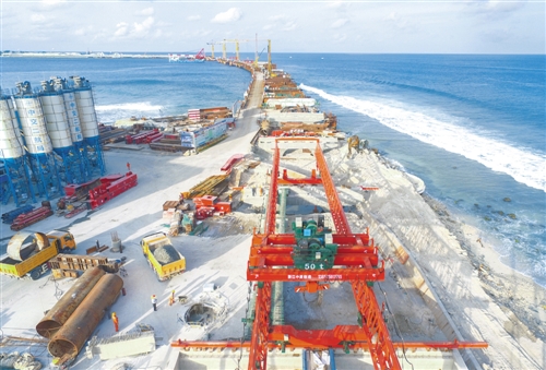 這是7月6日在馬爾代夫航拍的建設(shè)中的中馬友誼大橋。隨著主橋23號(hào)墩承臺(tái)最后一車混凝土的澆筑,中國(guó)援馬爾代夫中馬友誼大橋5個(gè)主橋承臺(tái)6日全部施工完成,標(biāo)志著占全橋施工總量約70%的主橋部分從此徹底擺脫印度洋的強(qiáng)涌浪襲擾,進(jìn)入上部結(jié)構(gòu)施工階段。