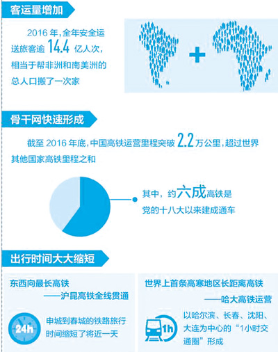 編織一張密度適宜的高鐵網(wǎng)絡(luò),造福盡可能多的民眾。十八大以來,我國高鐵版圖不斷延伸:2013年7月,穿越江南水鄉(xiāng)的寧杭高鐵開通;2014年6月,世界上一次性建成通車?yán)锍套铋L的高速鐵路蘭新高鐵建成通車;2016年12月,滬昆高鐵全線通車,彩云之南不再“邊緣”。截至2016年底,中國高鐵運營里程突破2.2萬公里,超過世界其他國家高鐵里程之和,除幾條線路外,2004年提出的“四縱四橫”高鐵網(wǎng)已全部建成。根據(jù)2016年7月新修訂的國家《中長期鐵路網(wǎng)規(guī)劃》(2016-2030年),預(yù)計到2020年,全國高速鐵路將增加到3萬公里。今年繼續(xù)保持高鐵網(wǎng)絡(luò)快速建設(shè)勢頭,就在上月初,寶蘭高鐵通車,將使千年絲路煥發(fā)更加蓬勃的生機(jī)。不久后,我們還將見證張呼客專馳騁于遼闊的大草原,而西成高鐵也將讓千年蜀道不再艱難。