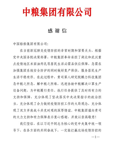 ????在這場戰(zhàn)“疫”中,中國船舶集團沒有缺席——所屬八院鵬力科技集團緊急承擔平面口罩機、N95口罩機、壓條機等醫(yī)療物資生產關鍵設備研制攻關任務,以“戰(zhàn)時速度”硬核抗疫。近日,中國石油、中糧集團、中國誠通集團等,紛紛發(fā)來感謝信,對鵬力科技集團的全力支持表達深深的謝意。