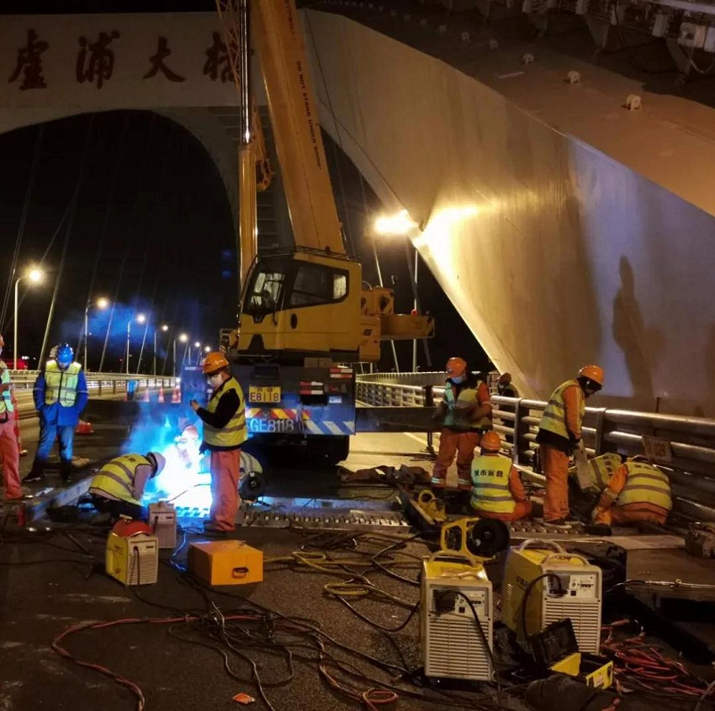 ????此時,來自中國船舶集團所屬上海盧浦大橋投資發(fā)展有限公司的守橋人開工了。近20平方米的施工區(qū)域,人頭攢動、焊花飛舞,工人身著的安全背心泛出的熒光,焊槍下閃爍的弧光和橋面的燈光交相輝映。