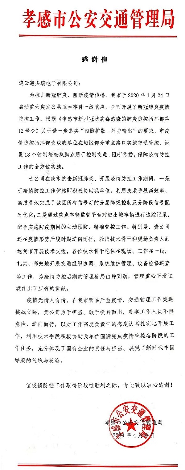 ????中國船舶集團(tuán)七一六所下屬杰瑞電子公司收到湖北省孝感市公安交通管理局發(fā)來的感謝信,對杰瑞電子赴孝感工作人員不懼危險、逆向而行,以高度負(fù)責(zé)任的態(tài)度,利用技術(shù)手段,積極協(xié)助疫情防控工作表示感謝。
