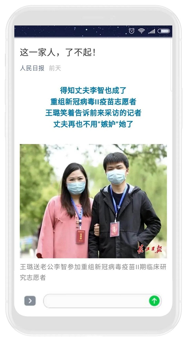 ????4月18日,人民日報微信公眾號推送了這樣一條消息,詳細(xì)介紹了一位土生土長的武漢人王璐及其家人自愿報名接種新冠疫苗的事跡,消息收獲了10萬+的閱讀量與3.2萬的“在看” ,還有動輒幾千的留言點贊!這位女主角王璐來自中國船舶集團(tuán)七一七所,不同于第一批結(jié)束醫(yī)學(xué)觀察的志愿者,王璐所在組的年齡在20歲到50歲,是最早一批高劑量的接種者。