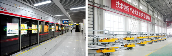 左圖:鄭州地鐵1號線使用七一三所軌道交通站臺門系統(tǒng);右圖:七一三所軌道交通站臺門門機(jī)系統(tǒng)生產(chǎn)現(xiàn)場