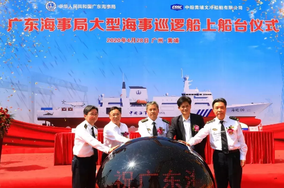 △ 4月28日,七〇一所設(shè)計(jì)的廣東海事局大型海事巡邏船上船臺。