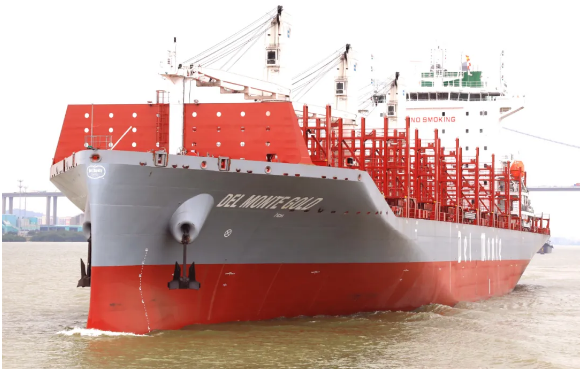 近日,中國(guó)船舶集團(tuán)旗下黃埔文沖為美國(guó)Del Monte公司建造的600FEU全冷藏集裝箱船首制船“DEL MONTE GOLD”號(hào)交付。該型船總長(zhǎng)192米,型寬30米,設(shè)計(jì)吃水9.3米,為國(guó)際遠(yuǎn)洋冷藏集裝箱船,全部貨柜箱均為冷藏集裝箱,是一款冷箱量大、裝載靈活、便于維護(hù)的綠色環(huán)保型船舶。