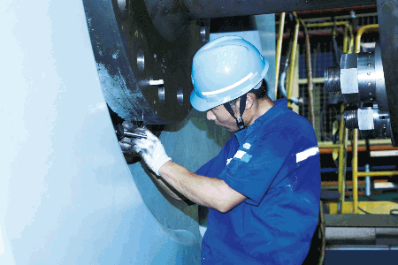 上海船院質(zhì)量檢測(cè)工程師正在檢測(cè)扭曲舵套筒。該扭曲舵由上海船院研發(fā)設(shè)計(jì),將用于黃埔文沖在建的2700TEU集裝箱船。