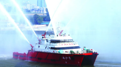 2010年12月28日,廣船國際為南沙區(qū)建造的“南沙號”消防船投入使用。“南沙號”消防船總長46米,型寬15米,排水量達(dá)到680噸,航速可達(dá)32.4公里/小時(shí),共設(shè)置有6門水炮。其中,2門主炮射程可達(dá)到150米,4門副炮射程可達(dá)到130米;還設(shè)置了全船水幕保護(hù)系統(tǒng),在火災(zāi)現(xiàn)場可有效保護(hù)自身安全。“南沙號”消防船是當(dāng)時(shí)國內(nèi)最大雙體專勤消防船,大大增強(qiáng)了對船舶火災(zāi)、石化碼頭、油庫火災(zāi)的撲救能力。