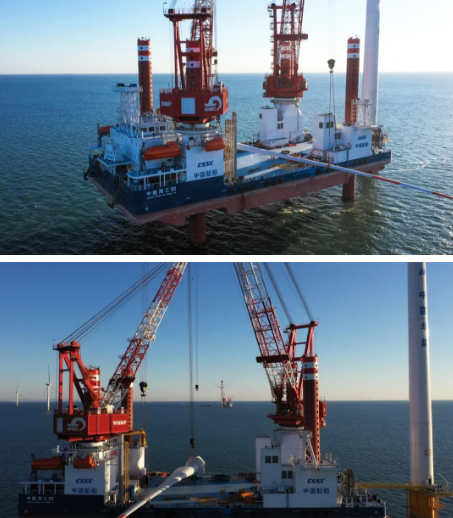 中國船舶集團建造的“中船海工101”號風(fēng)電安裝平臺正在海上作業(yè)