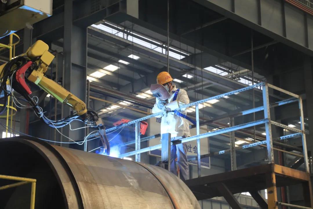 武漢船機(jī)鋼構(gòu)制造部員工正在操作焊接機(jī)器人焊接海工產(chǎn)品結(jié)構(gòu)件。