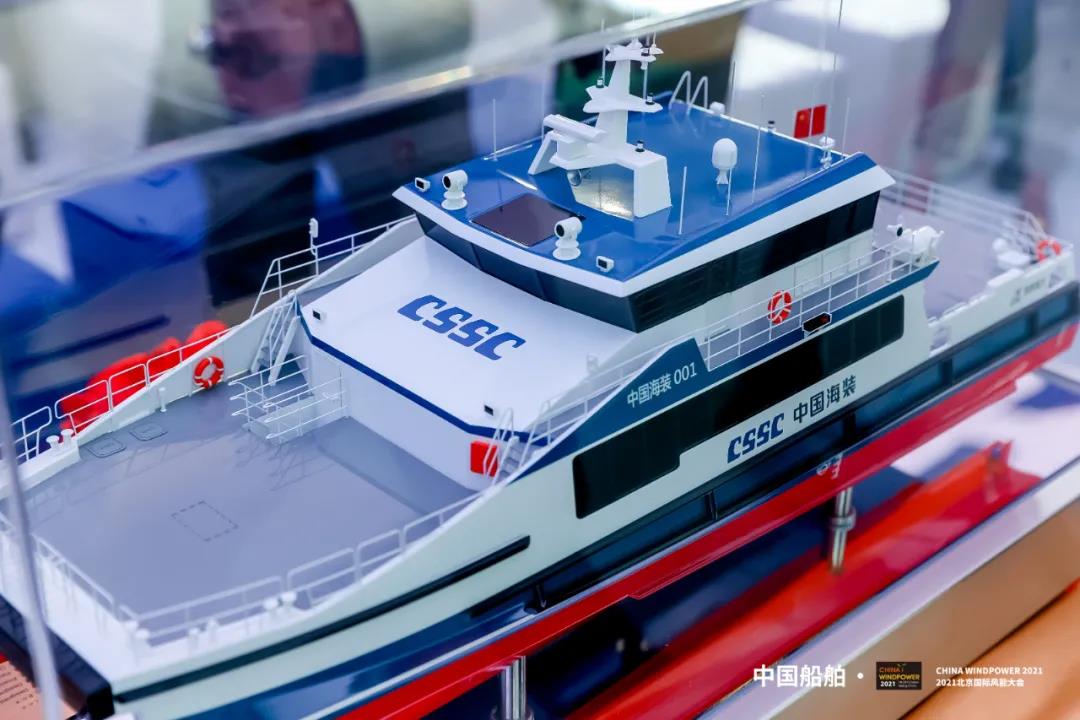 在本屆風能大會上,中國海裝與遠舟科技聯(lián)合設計制造的國內首艘30米級專業(yè)風電運維船發(fā)布。投運后,該船將與中船海工101海上風電安裝平臺一道,為海上運維“保駕護航”。
