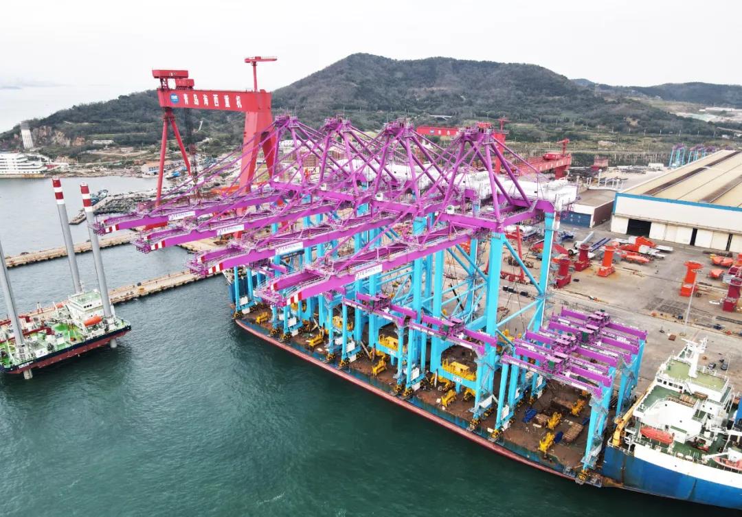 近日,武漢船機(jī)海西重機(jī)為卡塔爾哈馬德新港二期打造的4臺(tái)岸橋、10臺(tái)輪胎起重機(jī)從青島西海岸新區(qū)啟運(yùn)。