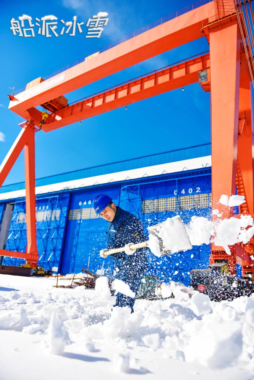 過膝的大雪掩埋了吊車的軌道,渤船小伙抄起“家伙”,為吊車開道,胳膊掄圓,雪花紛飛,別說這畫面還真有點(diǎn)浪漫了。
