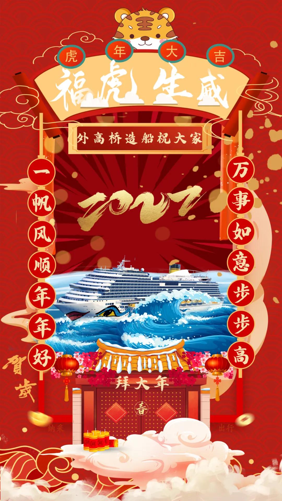 以門為前景,郵輪在海上乘風(fēng)破浪,寓意中國(guó)首制大型郵輪建造能取得開門紅!以紅色為背景,表達(dá)新年喜慶的節(jié)日氛圍,也祝福祖國(guó)郵輪產(chǎn)業(yè)的發(fā)展紅紅火火,蒸蒸日上!