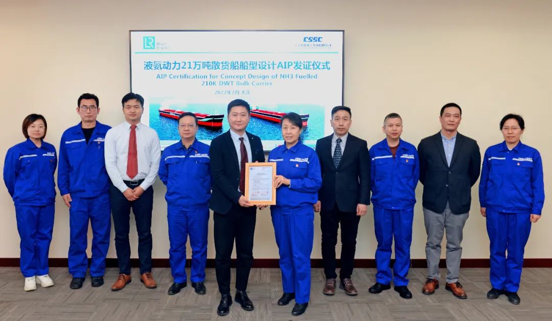 2月25日,中國船舶集團(tuán)旗下大船集團(tuán)最新研發(fā)的液氨動力21萬噸散貨船設(shè)計(jì)方案,獲英國勞氏船級社(LR)原則性認(rèn)可(AIP)證書。