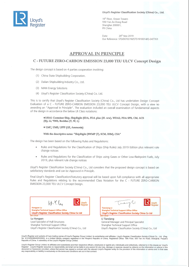 2020年,大船集團(tuán)研發(fā)的液氨動力超大型油船(VLCC)分別取得美國船級社(ABS)和中國船級社(CCS)頒發(fā)的AIP證書。