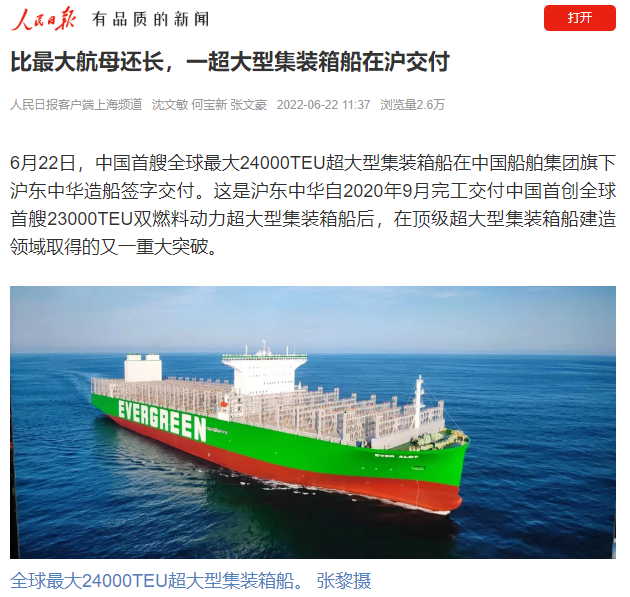 今天,中國首艘全球最大24000TEU超大型集裝箱船在中國船舶集團旗下滬東中華簽字交付,比最大航母還長,甲板面積相當(dāng)于3.5個標(biāo)準(zhǔn)足球場,最大堆箱層數(shù)可達(dá)25層,相當(dāng)于22樓的高度……