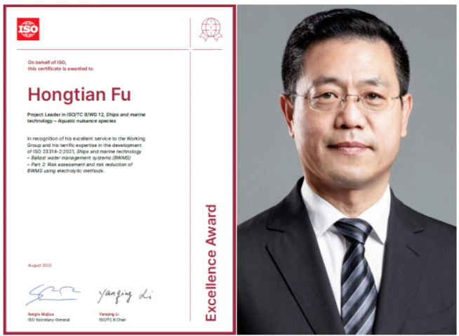 ISO卓越貢獻獎旨在表彰在上一年度ISO國際標(biāo)準制修訂工作中作出突出貢獻的專家、項目負責(zé)人或工作組召集人。此次頒獎表彰了付洪田在ISO 23314-2:2021《船舶與海洋技術(shù)—壓載水管理系統(tǒng)—電解法壓載水管理系統(tǒng)的風(fēng)險評估與風(fēng)險降低》國際標(biāo)準研制作出的貢獻。