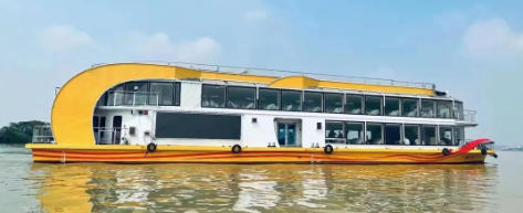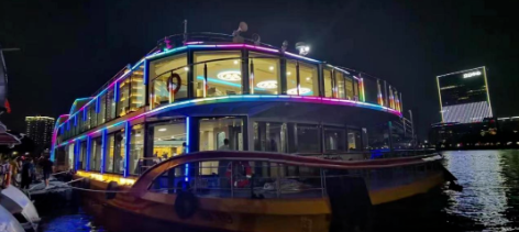 “廣游19”配置3015kWh純鋰電池驅(qū)動,Z形全回轉(zhuǎn)舵槳推進,經(jīng)濟航速下可滿足7小時續(xù)航要求。船體上建采用大面積玻璃幕墻,具有開闊的觀光視野,可360度觀賞珠江日景夜景,可提供江景游覽、娛樂餐飲、會議招待、婚禮、音樂舞會、年會等綜合服務。
