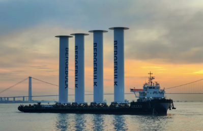 由中船澄西為Anemoi Marine Technologies公司建造的4套35米折疊式船用轉(zhuǎn)子帆,將安裝在一艘388000載重噸Valemax型礦砂船上,可以從垂直方向降低可折疊旋筒風帆,以減輕對氣流和貨物裝卸操作的影響。
