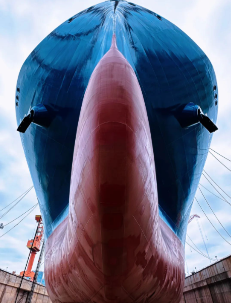 # 通過采用新型雙艉鰭線型,配備空氣潤滑系統(tǒng),進(jìn)一步提升了水動力性能,增強(qiáng)了推進(jìn)系統(tǒng)安全冗余;