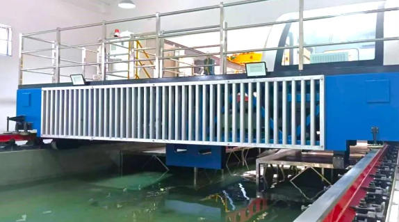 中山大學(xué)“拖曳水池建造” 項(xiàng)目包含了拖曳水池拖車、軌道系統(tǒng)、造消波系統(tǒng)、造風(fēng)系統(tǒng)等關(guān)鍵試驗(yàn)設(shè)備。拖車實(shí)現(xiàn)從0.02米/秒到8米/秒的高精度、高速比調(diào)速,滿足拖曳水池流速儀標(biāo)定和船舶試驗(yàn)的雙重需求;造風(fēng)系統(tǒng)實(shí)現(xiàn)了風(fēng)譜模擬能力。