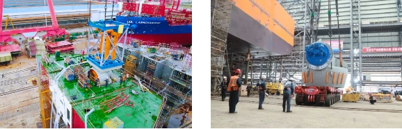 “夢想”號配備的7臺推進器中,3臺全回轉(zhuǎn)伸縮推是黃埔文沖迄今總成過的最大伸縮推,并且建造過程中伸縮推需要進行全程升降試驗,升降高度差達4.3米。完成試驗的伸縮推總段重量超過了船廠龍門吊最高900噸的起重能力。“夢想”號工藝負責(zé)人馮仕清創(chuàng)新性地提出了采用龍門吊和履帶吊聯(lián)合吊裝的方法,最終保證了伸縮推的成功安裝。