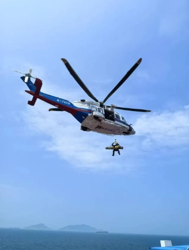 接報(bào)后,廣船國際立即啟動(dòng)航空救援,第一時(shí)間聯(lián)系海上航空救助和最近的珠海醫(yī)院,一場(chǎng)生死競(jìng)速在南海的碧海藍(lán)天間極速展開!在交通運(yùn)輸部南海第一救助飛行隊(duì)、珠海市中山大學(xué)附屬第五醫(yī)院和試航項(xiàng)目組的通力協(xié)作下,半小時(shí)后,藍(lán)白相間的救援直升機(jī)飛臨懸停試航船舶的直升機(jī)平臺(tái)。